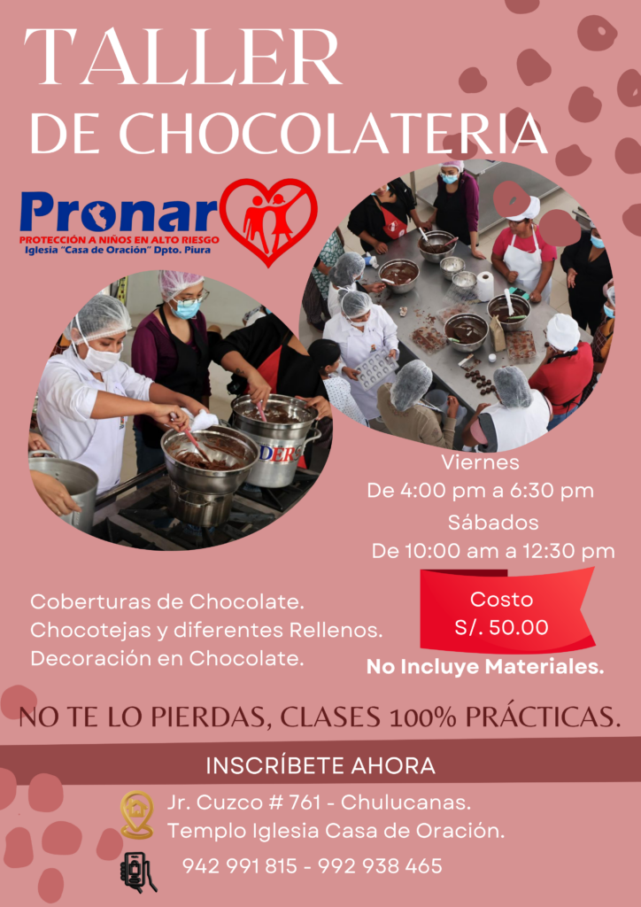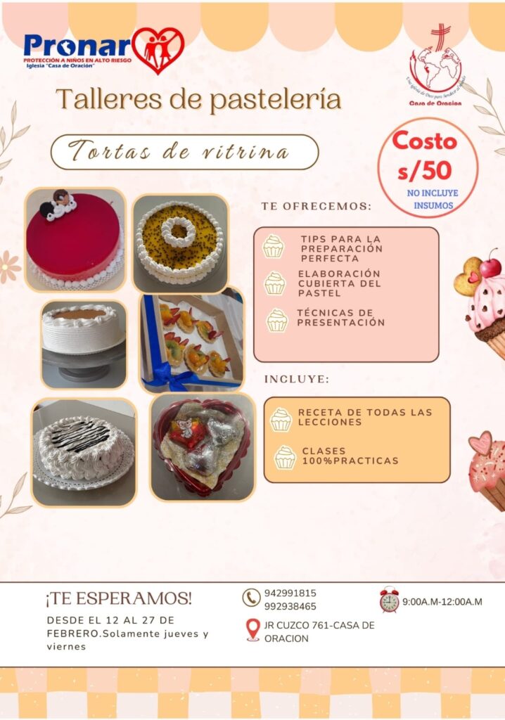 Cada clase es una oportunidad para aprender un oficio delicioso, compartir en familia o con amigos, y al mismo tiempo apoyar el trabajo de PRONAR, un programa social de la Iglesia Casa de Oración dedicado a la lucha contra la violencia infantil en sus diversas formas: física, psicológica y sexual.